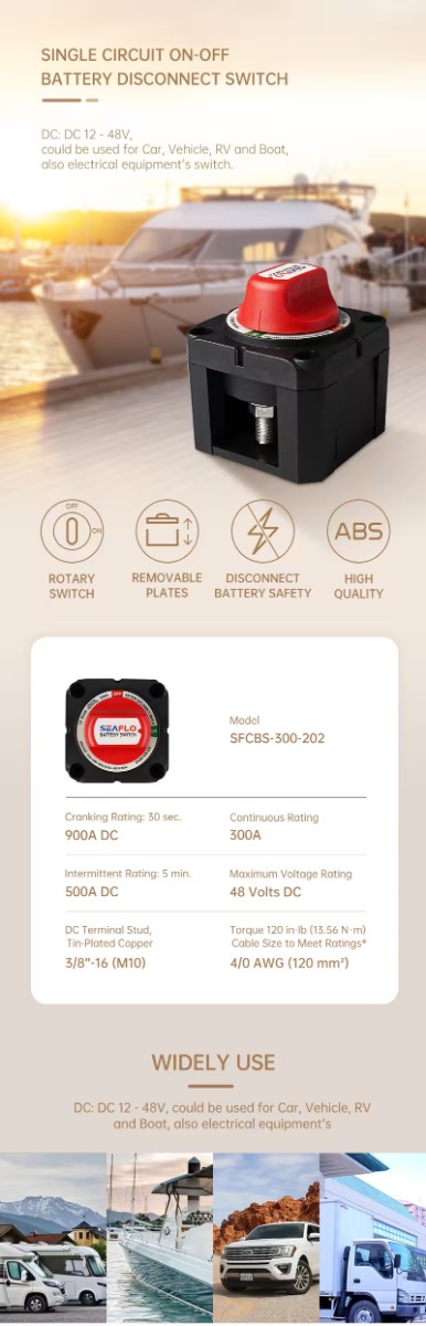 - Oppfyller alle krav fra American Boat and Yacht Council (ABYC) for batteribrytere